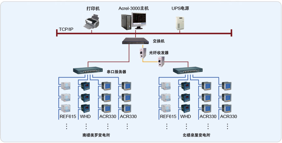 該系統(tǒng)總計(jì)有352只儀表(其中包括330只ACR網(wǎng)絡(luò)多功能電力儀表,12只ABB綜合保護(hù)裝置,10只變壓器溫控儀),分20條總線,其中北樓泉屋變電所8條總線,南樓美羅變電所12條總線,兩變電所之間距離較遠(yuǎn),采用光纖組網(wǎng)連接,再通過(guò)網(wǎng)線拉至南樓美羅變電所值班室連接到監(jiān)控主機(jī)實(shí)現(xiàn)總線上儀表與監(jiān)控主機(jī)的數(shù)據(jù)連通。