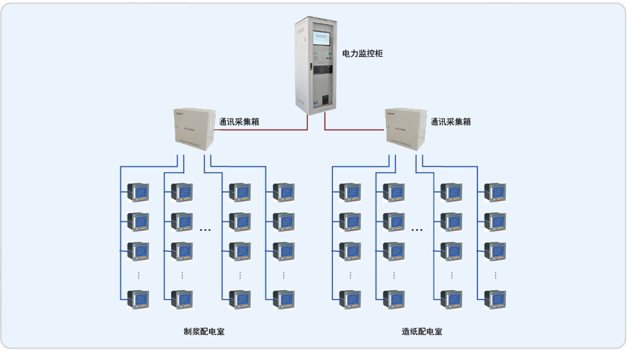 10kV回路的進線和饋線配有微機保護裝置;0.4kV進線和母聯回路裝有ACR330ELH電網質量分析儀,采集回路的常規電參量、四象限電度和電網質量參數;0.4kV饋線回路裝有PZ80L系列多功能電力儀表,采集回路的常規電參量和四象限電度。本系統儀表集中,所以均通過屏蔽雙絞線手拉手相連數據上傳至監控主機。